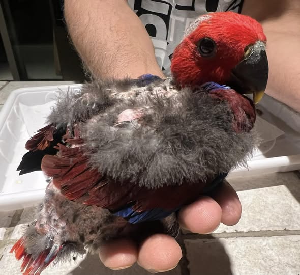 Aurelio displays the first hints of the baby male Vosmaeri Eclectus coloration—a rich crimson glow forming beneath his down. As his feathers develop, the soft maroon shadows deepening on his wings will transition into the classic, luminous red tones characteristic of Vosmaeri males. His early feather structure remains symmetrical, showing excellent hydration and balanced nutrient absorption.