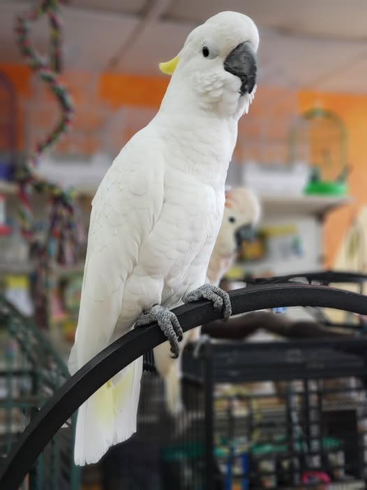 Mature yellow-crested cockatoo for rehoming. Kaelan is a breathtaking 2.9-year-old Sulphur-Crested Cockatoo whose commanding presence fills the room with energy and charm. His bright yellow crest fans upward with bold expression whenever he becomes excited or inquisitive, creating a stunning visual contrast against his clean white plumage. He is the perfect sulphur crested cockatoo young adult for owners who appreciate confidence, loyalty, and intelligence in a companion bird.